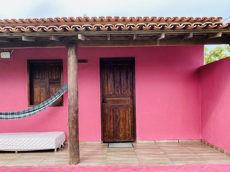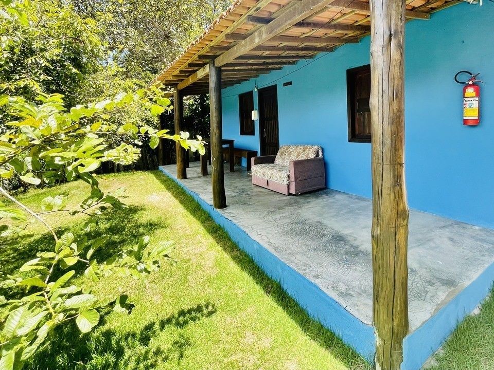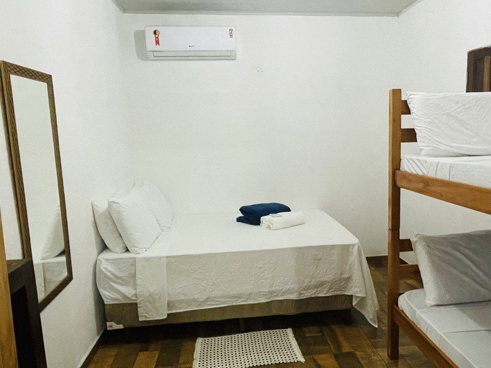 Quarto com banheiro privativo, cama de casal, beliche, frigobar, ar condicionado, wi-fi, varanda com rede e mesa. Fornecemos roupa de cama, toalhas, papel higiênico, sabonete e limpeza dia sim e dia não.
